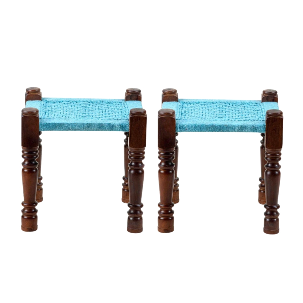 Blue Wooden Rope Stool Set of Two Stools