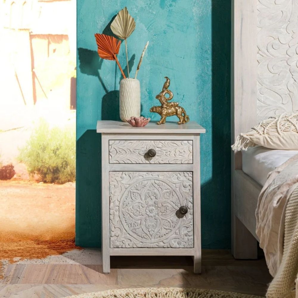 Upgrade your bedroom with the timeless beauty and functionality of our Hand Carved White Bedside Table. It’s the perfect combination of practicality and artisanal craftsmanship.