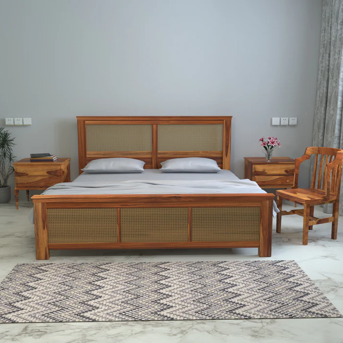 - **Authentic Cane** detailing on bedside tables adds a unique, vintage charm.
